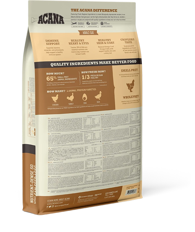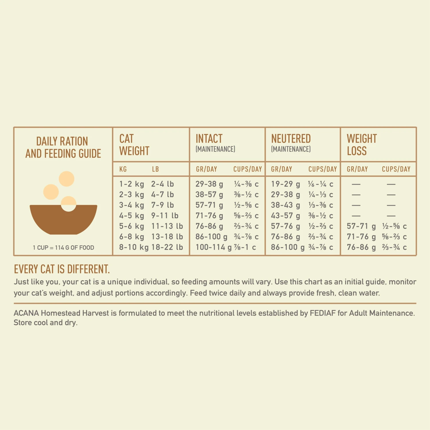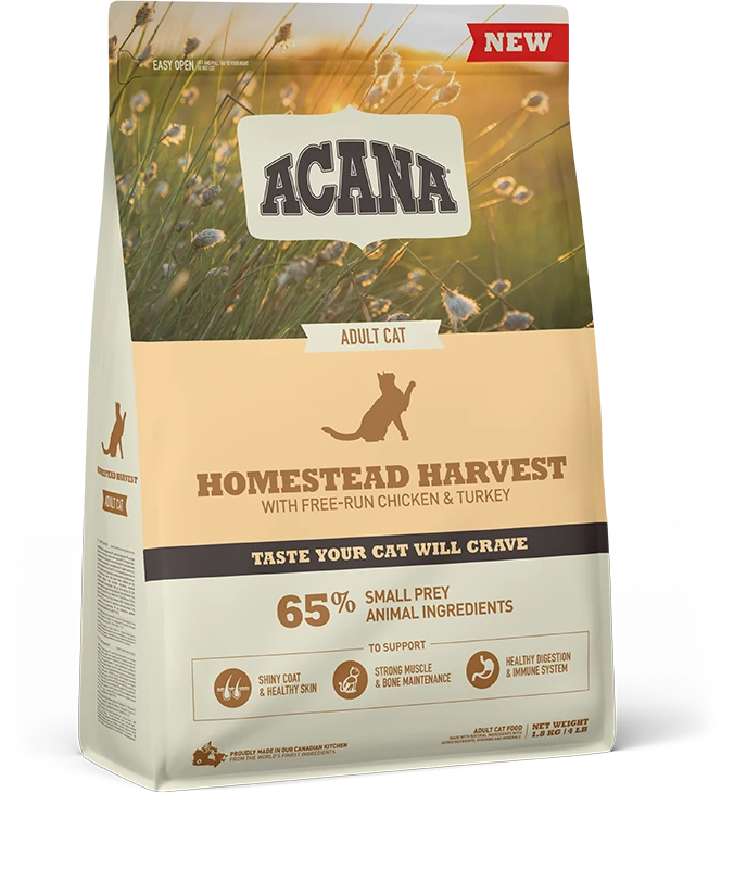 ACANA Homestead Harvest is packed with free-run chicken, turkey, and duck, in WholePrey ratios of poultry, organs, and cartilage, nourishing your cat naturally while offering a taste they crave, and keeping them healthy, happy, and strong.