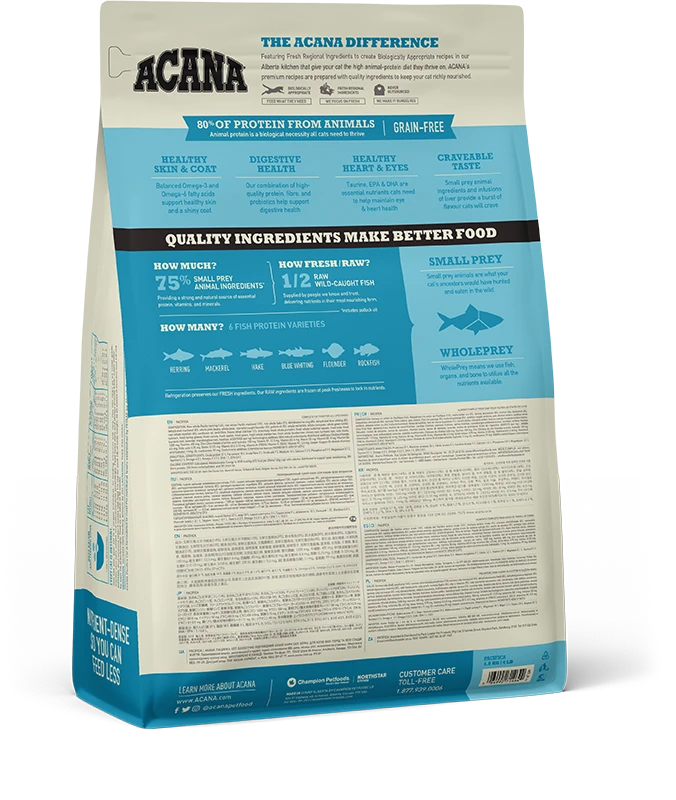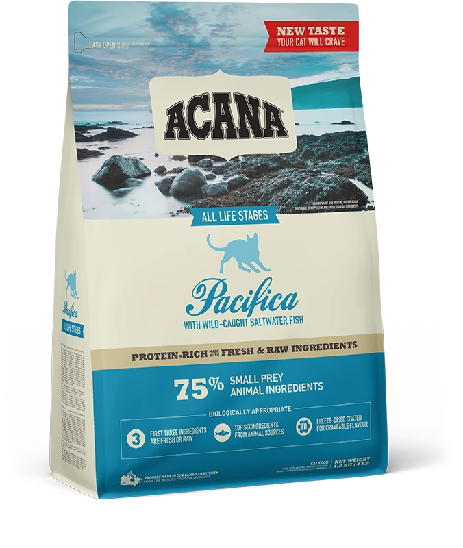 Bursting with wild-caught herring, mackerel, flounder, hake, and rockfish in WholePrey ratios of fish, organs, and bone, ACANA Pacifica naturally delivers the nutrients your cat requires for peak health, nourishing them the way Mother Nature intended.