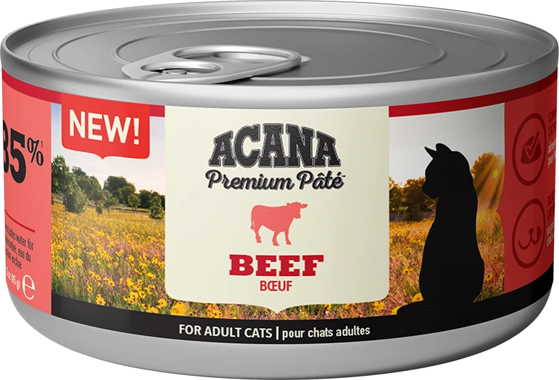 ACANA Premium Pâté is crafted with high-quality animal ingredients and comes in 6 delicious recipes that will satisfy your feline. Our Beef recipe is an animal protein-rich pâté crafted to completely satisfy your feline. Its premium animal ingredients and bone broth provide the quality nutrition your cat needs to live its fullest life.