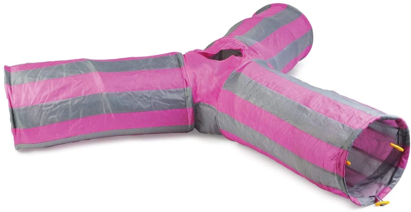 The fantastic Ancol Y-Shaped Play Tunnel has over 1.8 meters of tunnels to explore. The three tunnel entrances are a great for your cat to exercise, play, hide, nap and run through. At the point where the tunnels meet there is a pop-up hole for your cat to jump out of. This can also be used to dangle toys into when you and your cat play together. This tunnel is made of a crinkle material that cats love to paw at. This stripy grey and pink tunnel folds conveniently flat when not in use for compact and simple storage.