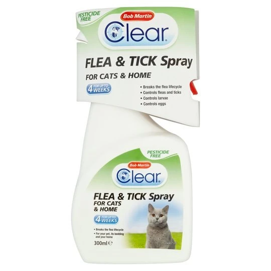 Bob Martin FleaClear Cat & Home Spray is the only flea spray you will need tocontrol fleas and ticks both on your cat and in your home. This pesticide freespray works in a unique way by immobilizing the flea or tick.