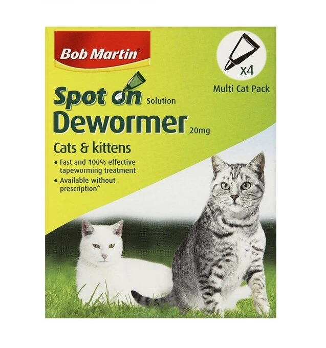 Bob Martin Spot On Dewormer cat tapeworm treatment has been specially developed to make worming easy without the bites scratches and other problems associated with trying to give tablets to a cat. Simply apply the solution to the back of your cat’s neck for fast effective treatment. Spot On Dewormer starts working almost immediately and is 100% effective at controlling the most common worms affective cats and kittens. There is no permanent treatment for worms. Veterinarians recommend that weaned kittens and adult cats be wormed every 3 months as a routine measure. It is also important to remove sources of possible re-infestation such as fleas and mice. For cats and weaned kittens weighing more than 1kg.