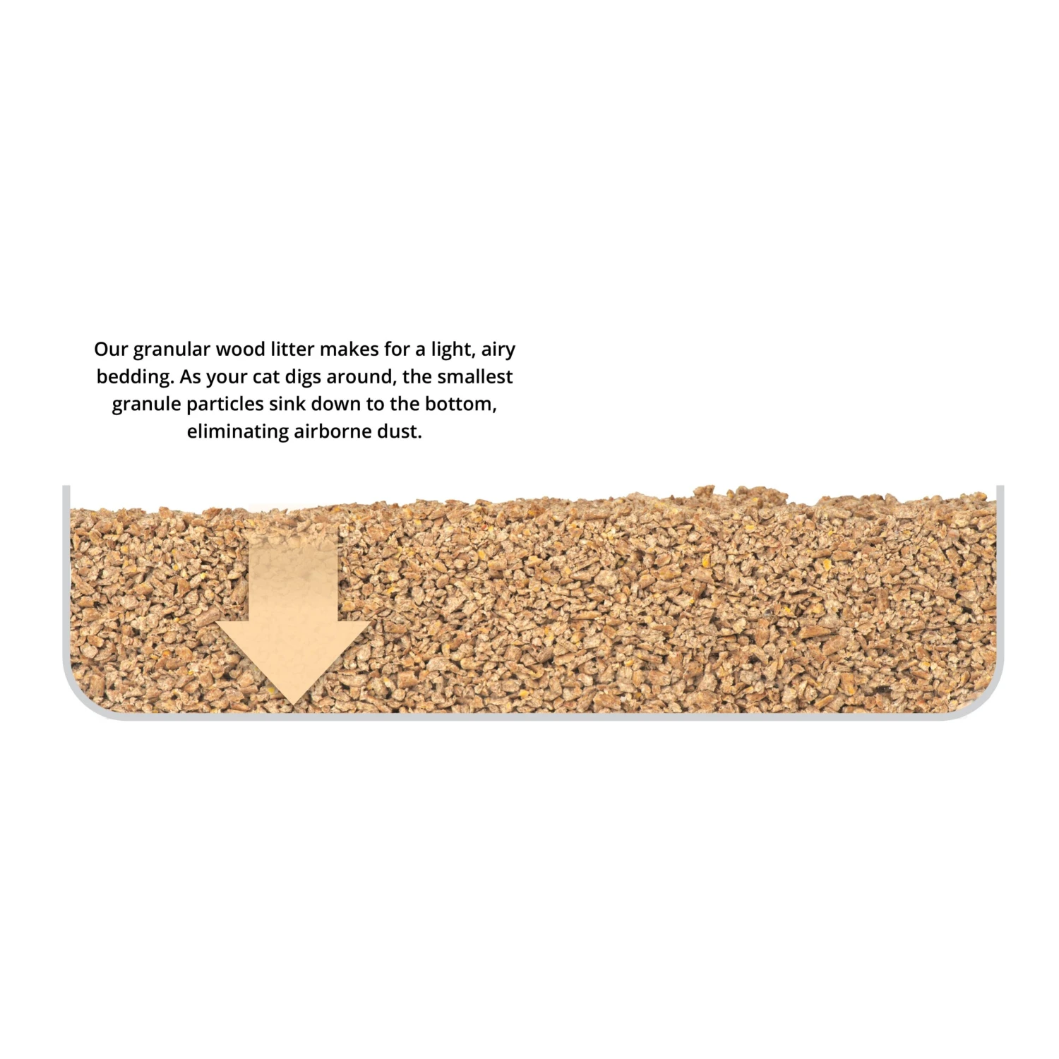 Unlike most litters, ours is pelletised and then crushed into smaller granules, which cover cat droppings and absorb cat urine much more effectively than standard pellets. This means less litter is wasted and a bag lasts you longer!