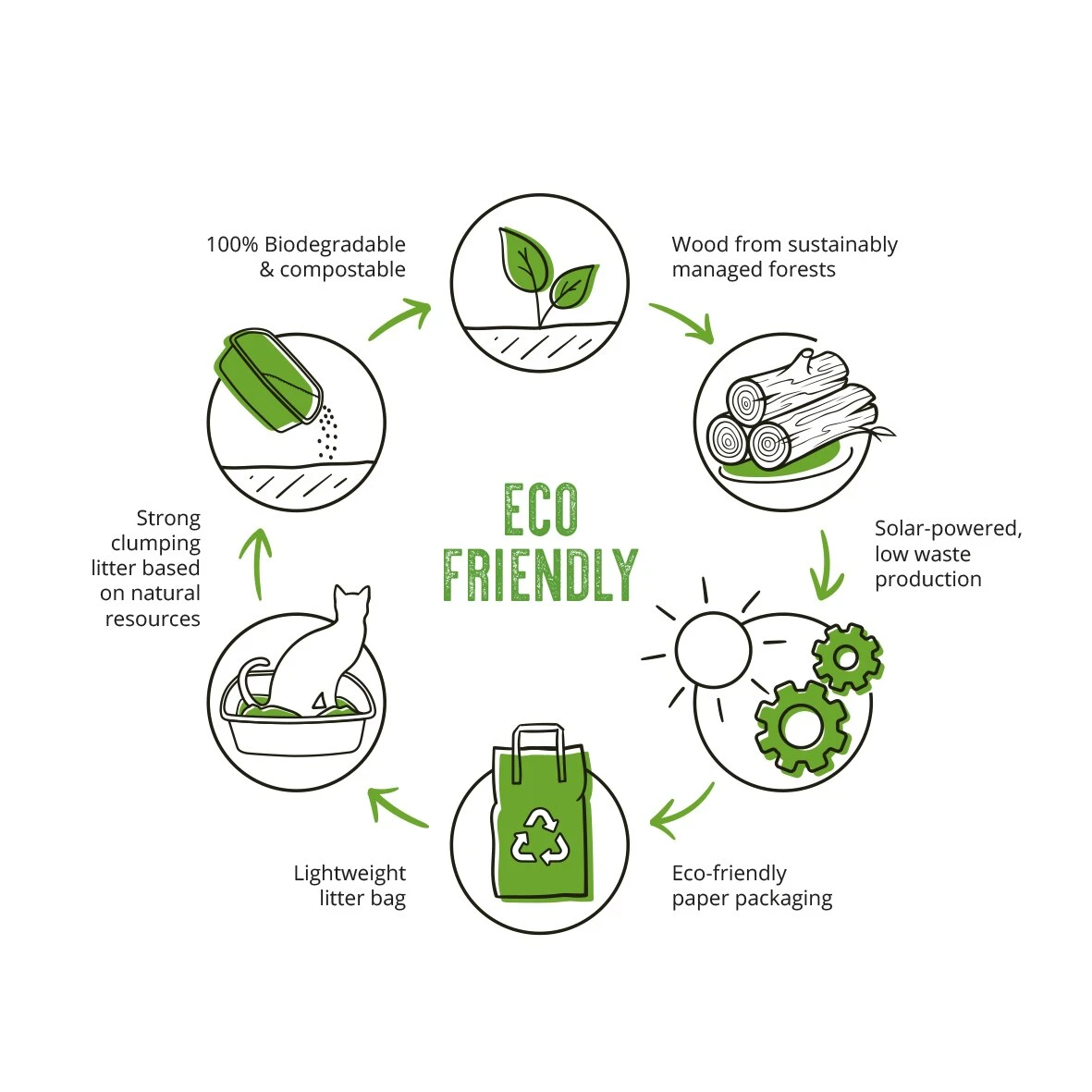 Since our litter is very lightweight yet super-absorbent, we save a ton on CO2 during transportation and warehousing. In addition, our packaging bags are made from recyclable cellulose paper.