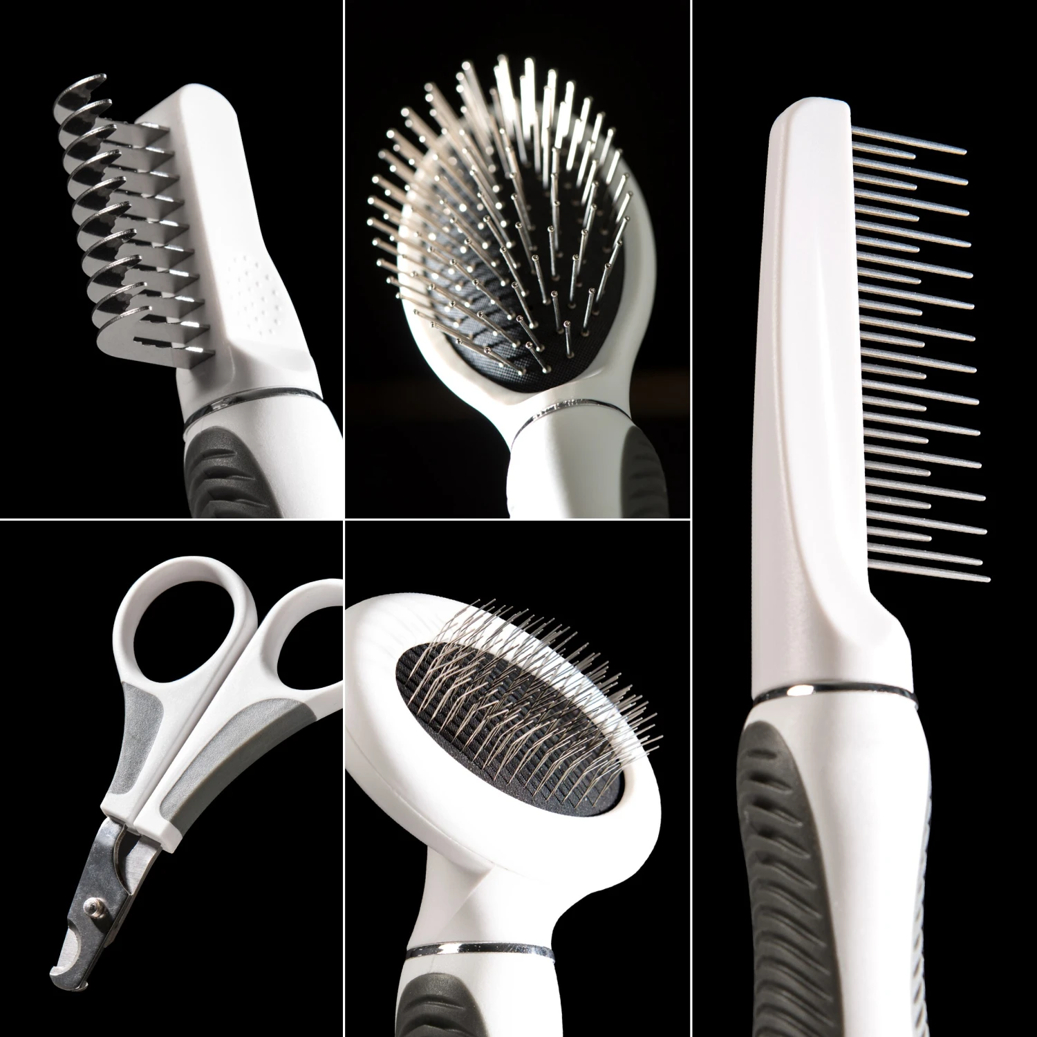 Contains every tool needed for daily grooming: pin brush, metal slicker brush, long dematter tool, grooming comb with rolling pins, and curved nail clipper