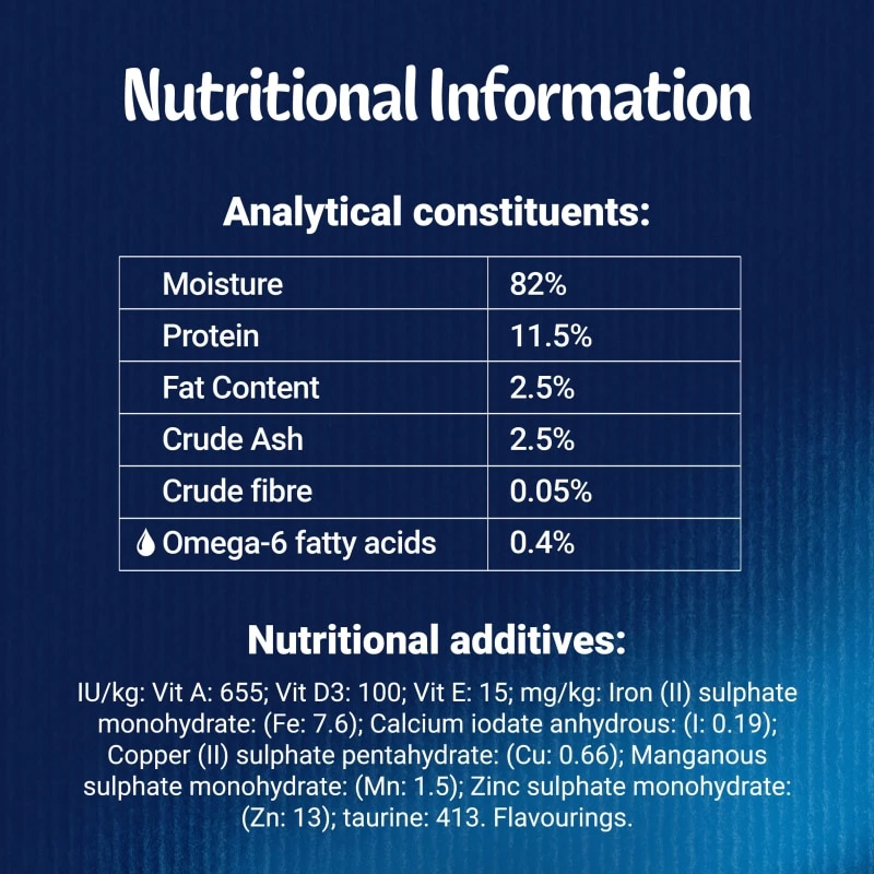 For an average adult cat (4kg), feed 3 to 4 pouches per day in at least 2 separate meals. The adult maintenance averages are based on moderately active cats at normal environmental temperatures. Individual needs vary and feeding should be adjusted as required to maintain your cat at a lean, healthy body weight. Serve at room temperature. Clean, fresh drinking water should always be available.