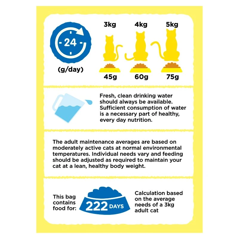 The adult maintenance averages are based on moderately active cats at normal environmental temperatures. Individual needs vary and feeding should be adjusted as required to maintain your cat at a lean, healthy body weight.