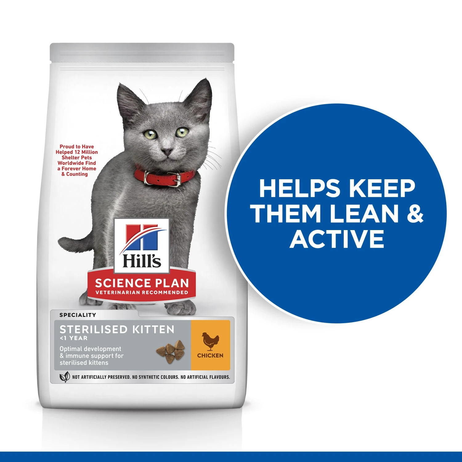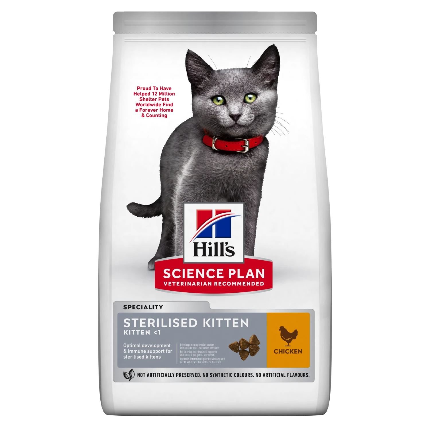 Hill’s Science Plan Sterilised Kitten cat food was created with Hill’s unique understanding of the specific requirements of sterilised kittens. It provides high quality protein for muscle development, paired with controlled fat to prevent risks of getting overweight after neutering. In addition, the unique blend of antioxidants promotes a healthy immune system to support your kitten’s growth. Feed this nutrition for the balanced development of healthy kittens. Delicious, nutritious recipe which is easy-to-digest. Balanced nutrition with high quality protein to help support healthy muscles and lean shape. Antioxidants to support a healthy immune system. Controlled levels of fat help provide the right amount of energy to support healthy weight in growing kittens after sterilisation. Dry kitten nutrition specifically developed for the healthy development and immune support of sterilised kittens. Provide your sterilised kitten the building blocks for a healthy growth with this food. Made with natural ingredients with added vitamins, minerals and amino acids. Made with high quality ingredients. Veterinarian Recommended.Â