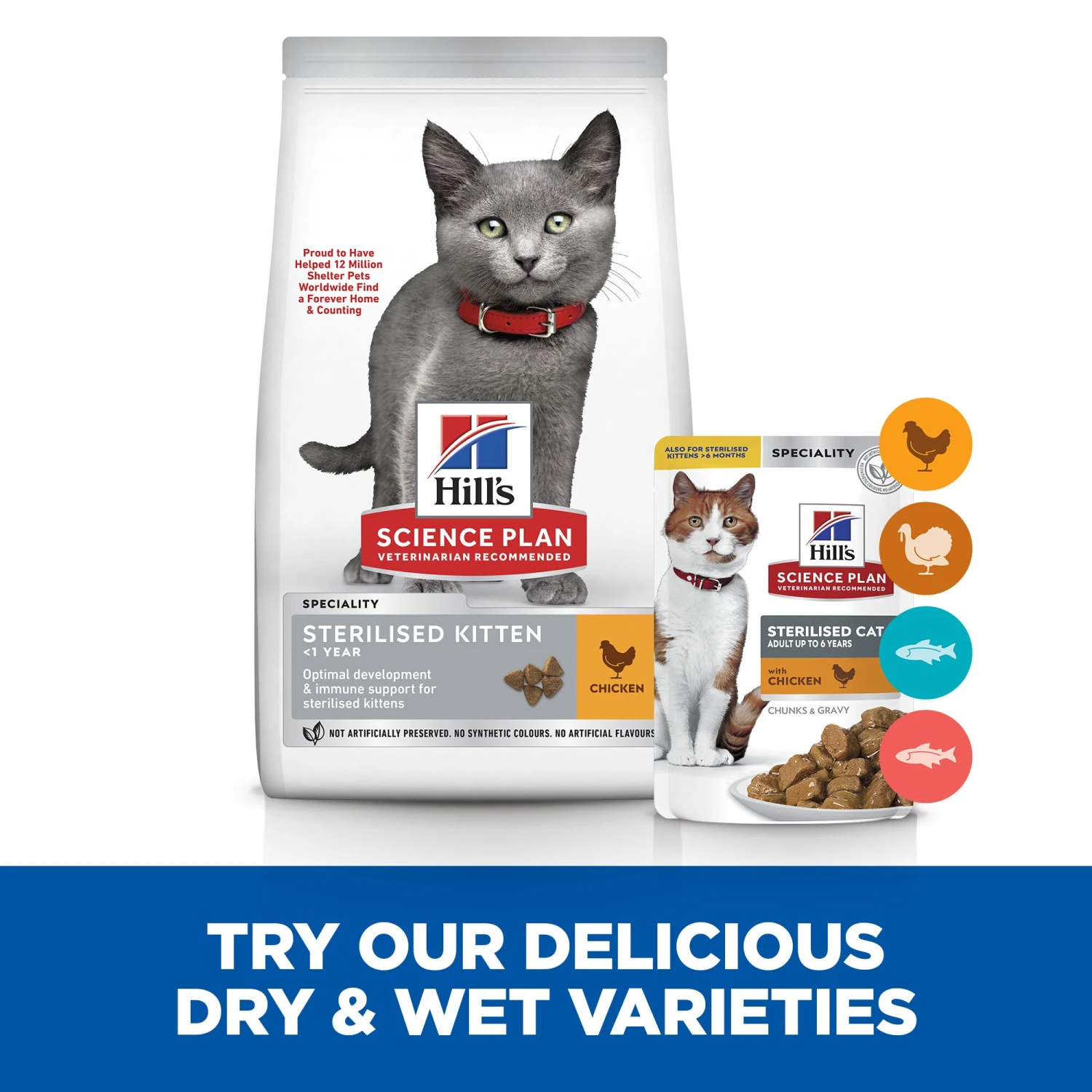 Hill’s Science Plan Sterilised Kitten cat food provides delicious, complete and balanced nutrition for the optimal development & immune support of sterilised kittens, so they get the best start in life & grow to their full potential.