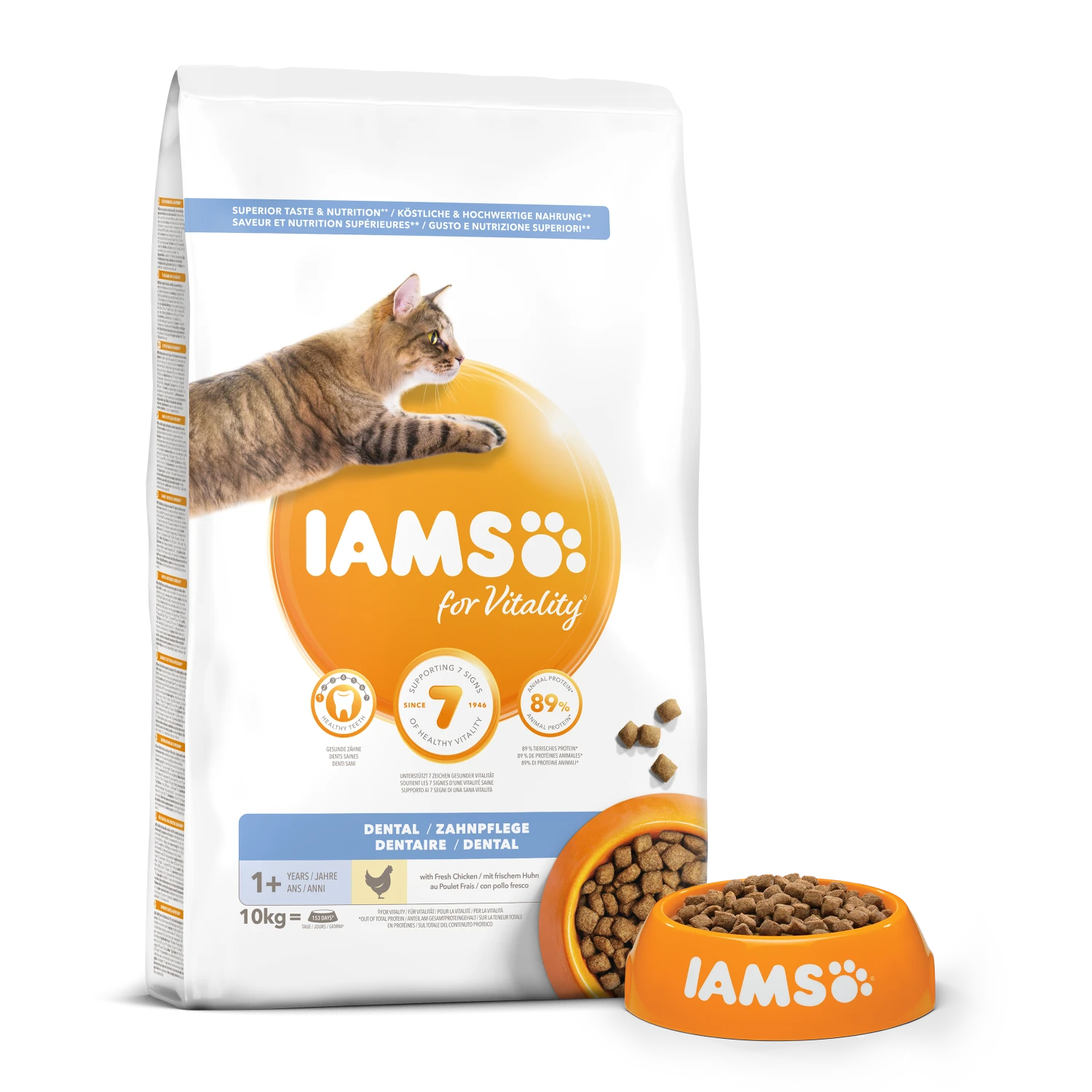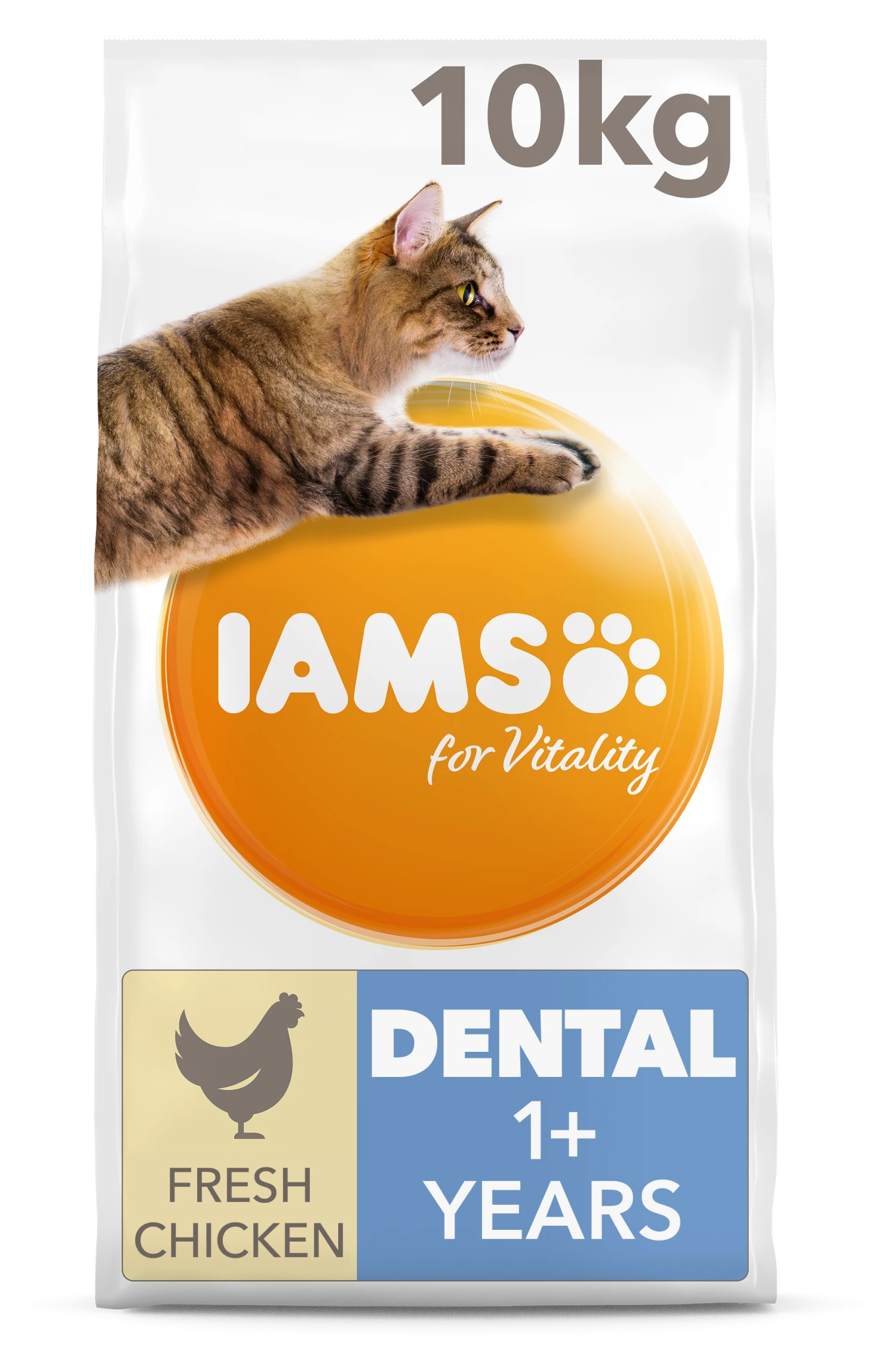 IAMS for Vitality Dental with fresh chicken for adult and senior cats is a 100% complete and balanced pet food that nourishes your cat’s healthy vitality.