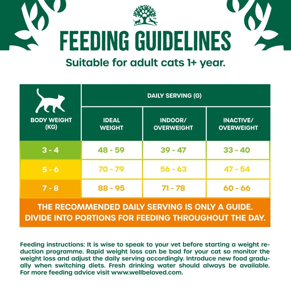 Analytical Constituents: protein 34.0%, crude fibres 3%, fat content 10.5%, crude ash 8.7%, Vitamin E 600mg/kg, omega-3 fatty acids 1.4%, omega-6 fatty acids 1.5%, Energy Value (ME) 345kcals/100g