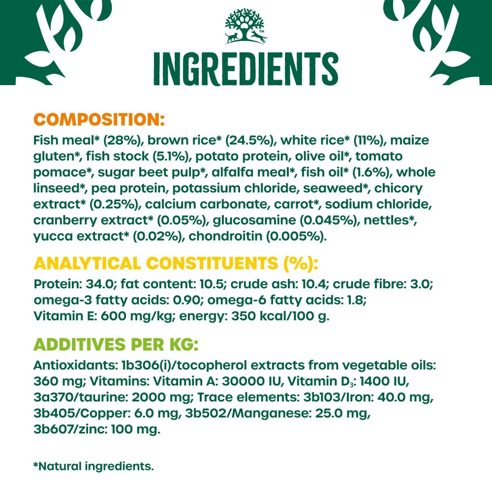 Fish & Rice Light Cat Food. Ideal for weight control in adult catsA complete dry food with the bonus that it is hypo-allergenic. With selected protein source fish and selected carbohydrate source rice, it is a dietetic food, excellent for the reduction of ingredient and nutrient intolerences. We suggest that the food be tried for a period of 3 to 8 weeks. If the signs of the food intolerence disappear, continue feeding indefinitely. By virtue of its lower energy density, this food is also designed to facilitate the reduction of excess body weight. For this purpose, the food may be used until target weight is achieved. Composition: rice, white fish meal, maize gluten, fish stock, potato protein, olive oil, tomato pomace, sugar beet pulp, alfalfa meal, fish oil, whole linseed, potassium chloride, natural seaweed, chicory extract, calcium carbonate, carrot, sodium chloride, cranberry extract, glucosamine, nettles, chondroitin, yucca extract. Minimum levels: fish (26%), rice (26%), fish stock (4%), tomato pomace (3%), linseed (1%), yucca extract (0.02%), chicory extract (0.25%), cranberry extract (0.05%), glucosamine (0.02%), chondroitin (0.02%), nettles (0.02%). Additives per kg: antioxidants: E306/Natural antioxidant, 200mg, Vitamins: E672/Vitamin A, 30,000 iu, E671/Vitamin D3, 2,250 iu, Amino acids: taurine, 2000mg. Trace elements: E1/iron, 40mg, E2/iodine, 2mg, E4/copper, 5mg, E5/manganese, 25mg, E6/zinc, 100mg. Analytical Constituents: protein 34.0%, crude fibres 3%, fat content 10.5%, crude ash 8.7%, Vitamin E 600mg/kg, omega-3 fatty acids 1.4%, omega-6 fatty acids 1.5%, Energy Value (ME) 345kcals/100g