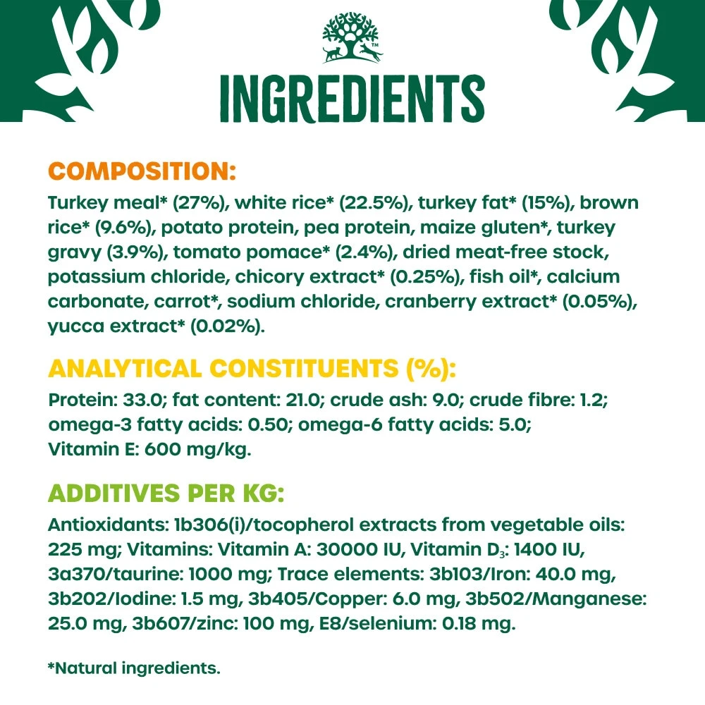 A complete dry food with the bonus that it is hypo-allergenic. With selected protein source turkey and selected carbohydrate source rice, it is a dietetic food, excellent for the reduction of ingredient and nutrient intolerences. We suggest that the food be tried for a period of 3 to 8 weeks. If the signs of the food intolerence disappear, continue feeding indefinitely.