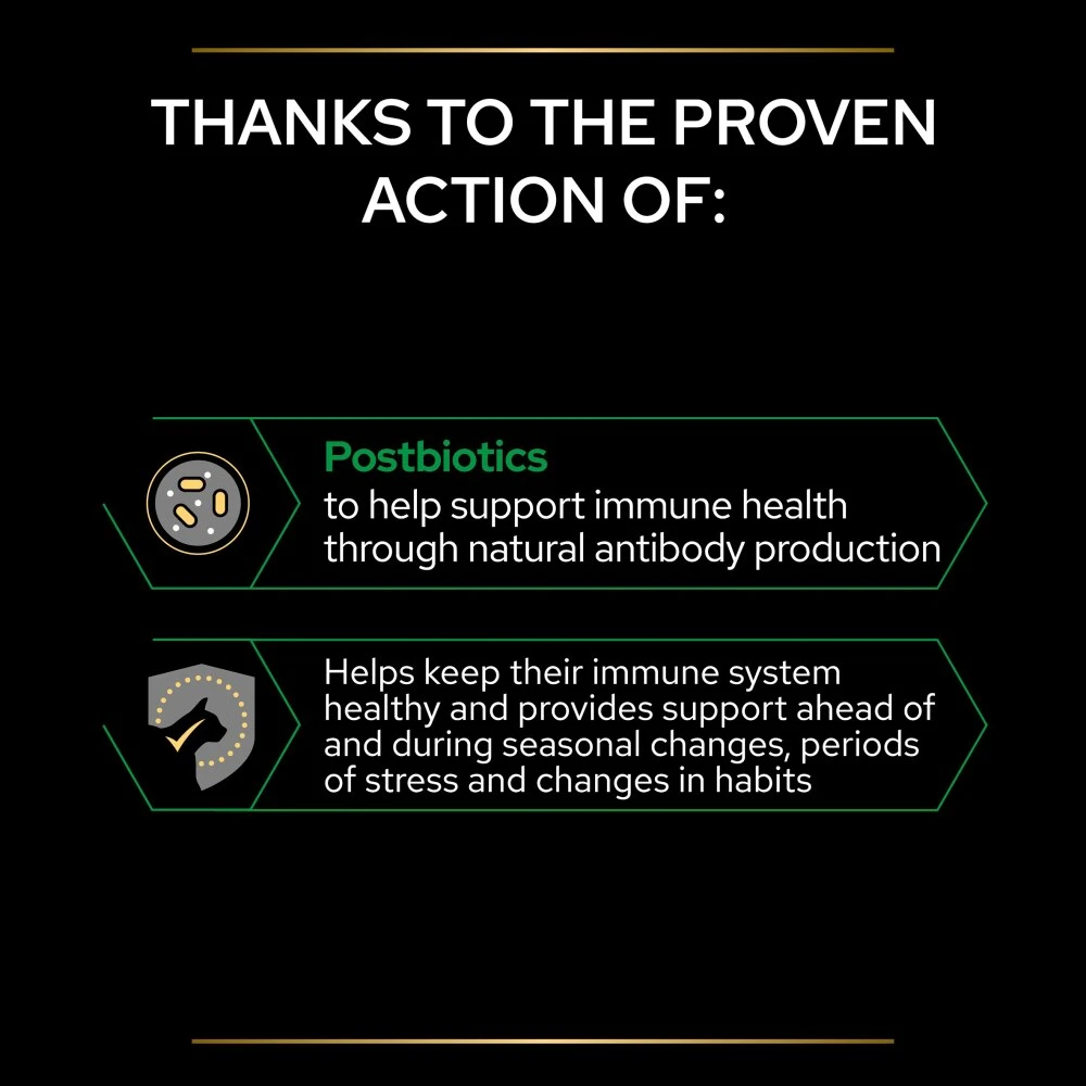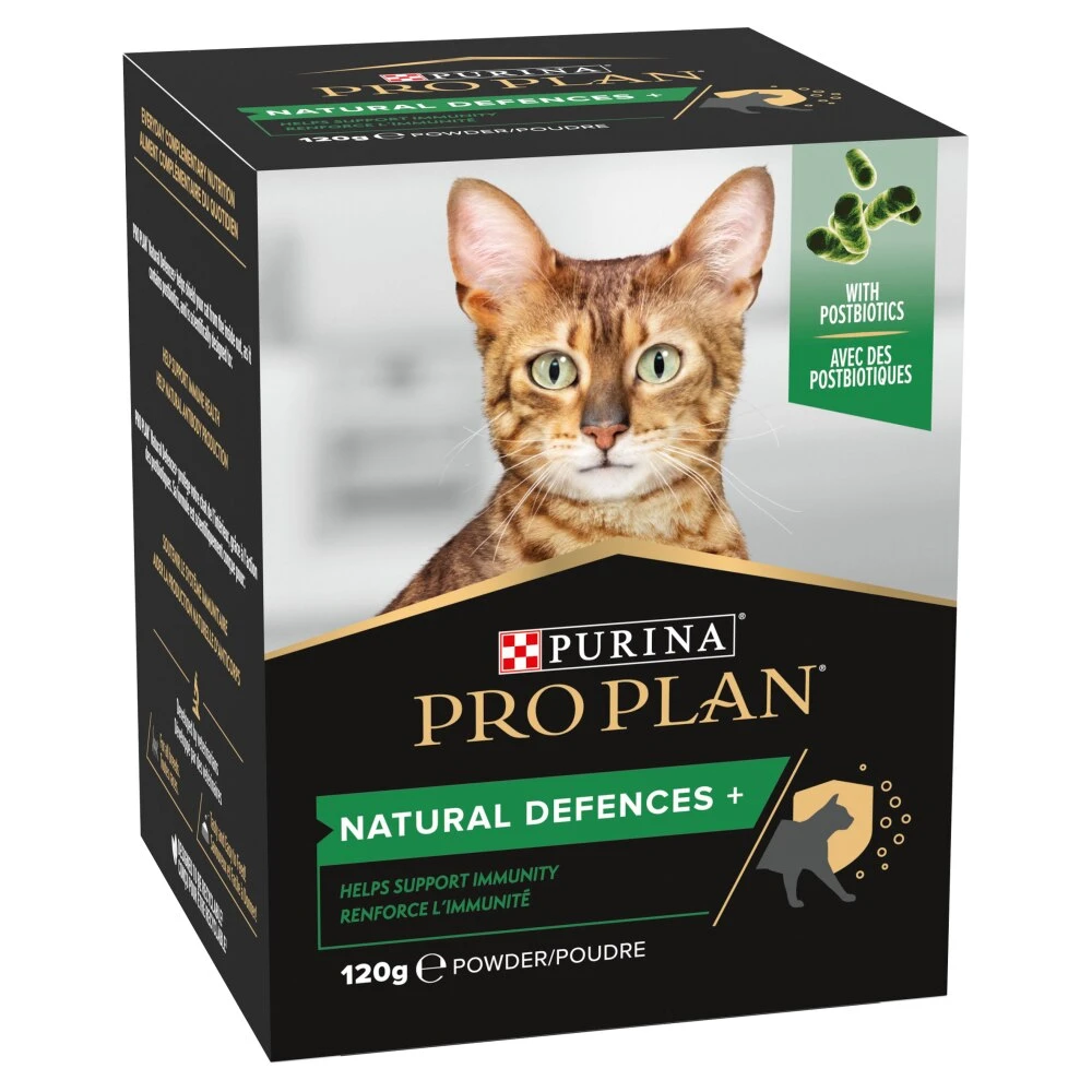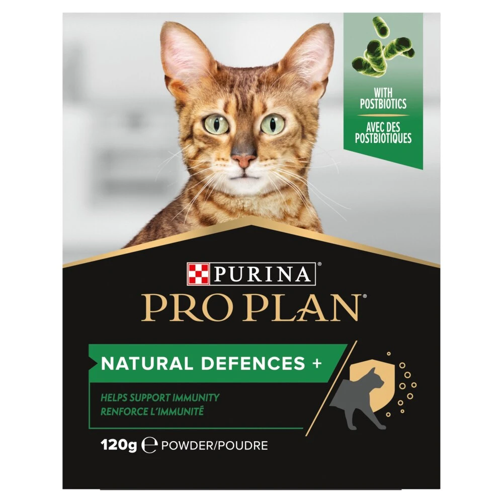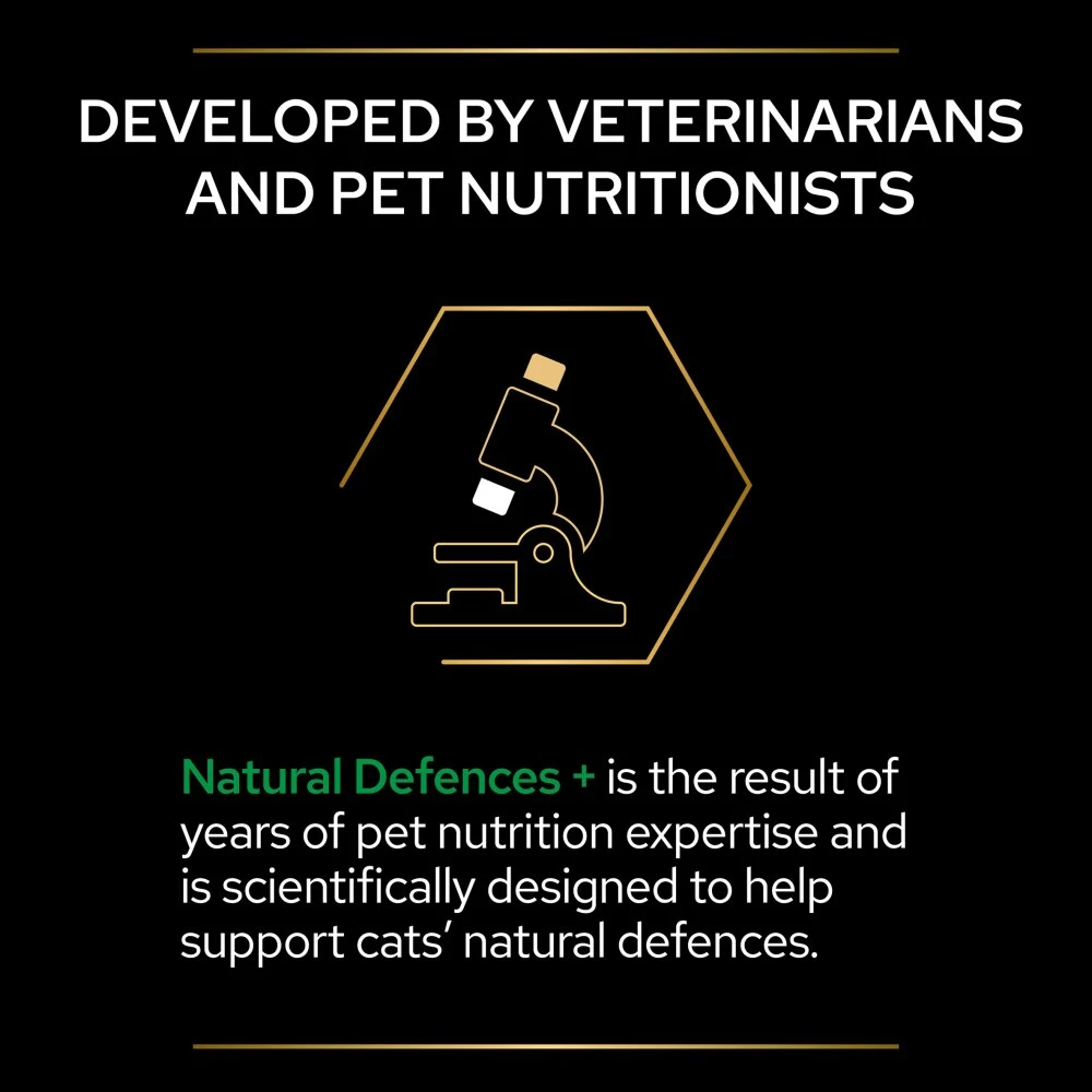 PRO PLAN Natural Defences + helps shield your cat from the inside out, as it contains postbiotics, and is scientifically designed to: