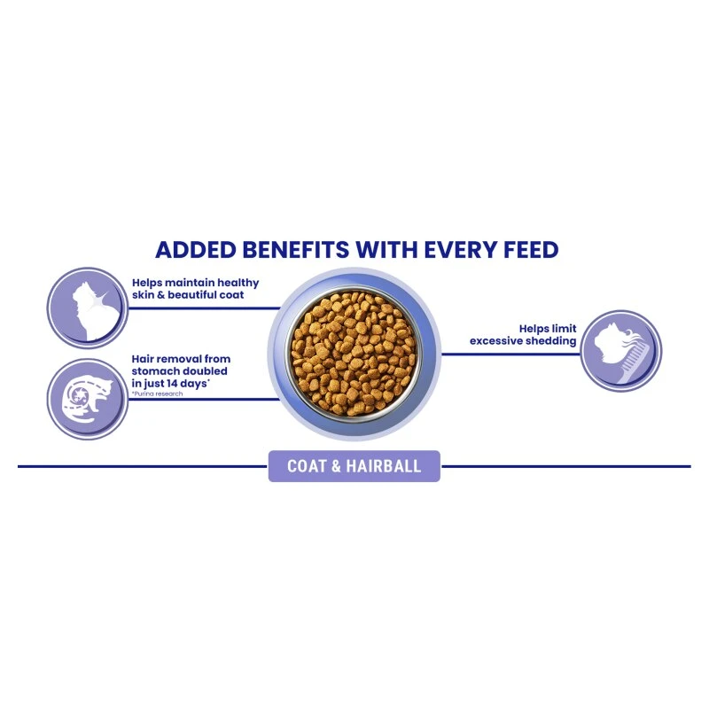 Purina ONE Coat & Hairball is specially formulated to effectively maintain healthy skin and a beautiful coat for your cat.