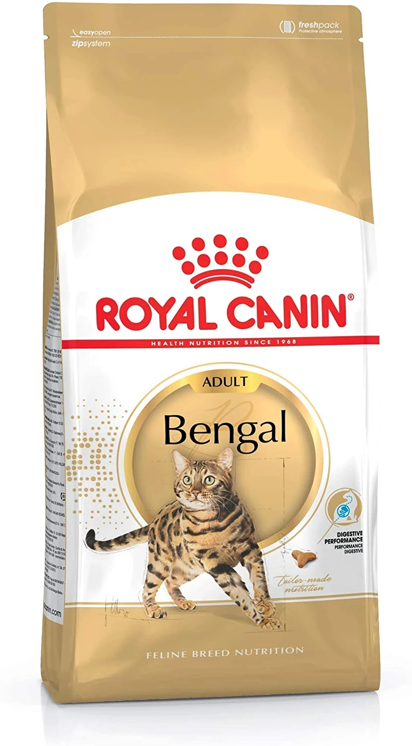 The Bengal, affectionately known as ‘The Little Leopard’, is a breed with an interesting origin; a cross between the domestic cat and the Asian Leopard Cat resulted in the beautiful Bengal. With large, striking eyes and a distinctive coat of remarkable patterns, the Bengal visually epitomises the wild more than any other breed.ROYAL CANIN® Bengal Adult is exclusively formulated with the nutritional needs of your Bengal cat in mind. By containing a high level of protein and an adapted fat content, this food contributes significantly to maintaining your Bengal’s muscle mass to sustain its highly active lifestyle.A highly digestible, high protein diet is best advised to support healthy digestive function in your Bengal. That’s why ROYAL CANIN® Bengal Adult food contains L.I.P proteins (Low Indigestible Proteins) specially selected for its high digestibility. It also includes prebiotics that help to support a good balance in the intestinal flora.The kibble in ROYAL CANIN® Bengal Adult is specially designed in a Y-shape to suit the shape of your Bengal’s jaw. It also encourages chewing to help support good oral hygiene. What’s more, the balance of minerals in the food helps to maintain a healthy and functional urinary system.Your Bengal’s distinctive coat needs special attention and care in order to keep it in top condition. ROYAL CANIN® Bengal Adult food contains specific amino acids, vitamins, as well as omega-3 and omega-6 fatty acids to help maintain its glossy coat and healthy skin.At ROYAL CANIN® we’re committed to providing nutritional solutions to your pet’s needs. All of our products undergo an extensive quality control process in order to guarantee the optimum quality of food as well as catering to your cat’s specific dietary requirements and lifestyle. This means that when your cat eats ROYAL CANIN® Bengal Adult, it’s getting a complete and balanced diet.