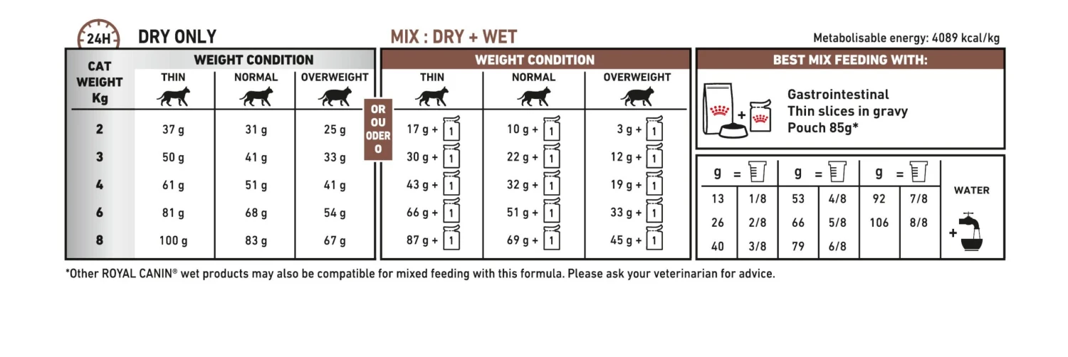 ROYAL CANIN® Gastrointestinal is specifically formulated to support the nutritional needs of cats with digestive sensitivities. This dry food product is available in either 2 kg or 4 kg bags. This formula contains high quality nutrients and an optimal balance of fibres to support healthy digestive transit. ROYAL CANIN® Gastrointestinal formula is highly palatable, even to cats with a decreased appetite. ROYAL CANIN® Gastrointestinal is formulated with a high energy content. This helps to reduce the volume of each meal, which decreases the intestinal load and makes digestion easier for your cat. If your cat is overweight or prone to weight gain, consider offering them ROYAL CANIN® Gastrointestinal Moderate Calorie that contains all of the benefits of their counterpart, just with fewer calories. As part of the ROYAL CANIN® Veterinary Health Nutrition range, it’s important that this product is only given to your pet when recommended by a veterinary professional. To cater to each cat’s individual preferences, ROYAL CANIN® Gastrointestinal is also available as wet food in gravy. If you’re considering mixed feeding, simply follow the on-pack feeding guidelines to ensure your cat gets an accurate amount of both wet and dry food for optimal benefit.