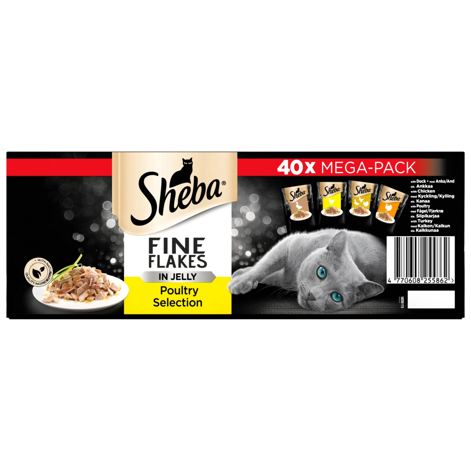 - Available in convenient 85g cat food pouches, Sheba Fine Flakes wet cat food with Poultry in jelly is gently prepared, with an exquisite flavour that cats love, time and again