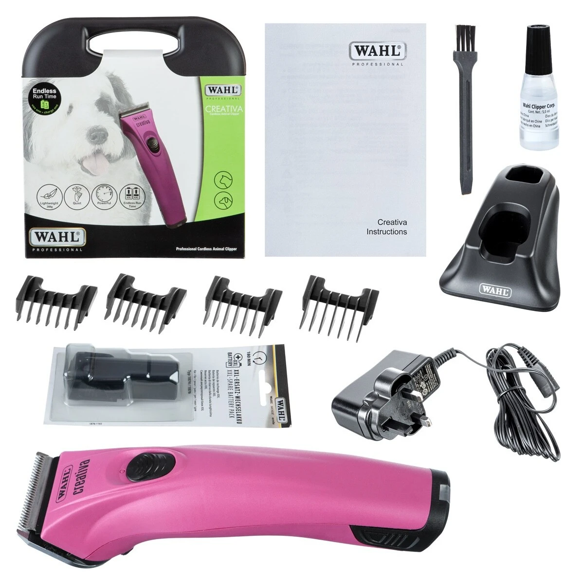 Creativa Cordless Animal Clipper, 4 attachment combs (#1-4), charging stand, spare XXL battery pack, blade guard, blade oil, cleaning brush and instruction booklet